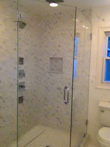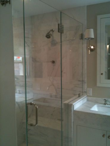 Modern glass shower enclosure with marble tiles and chrome fixtures.