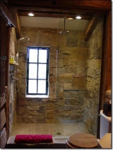 Modern bathroom with beige stone walls and glass shower enclosure.
